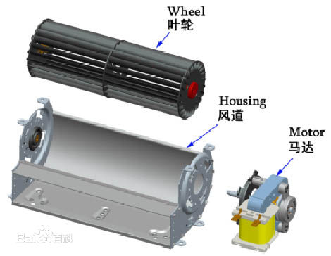 風機結(jié)構(gòu)貫流風機主要由葉輪、風道和電動機三部分組成。